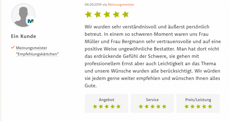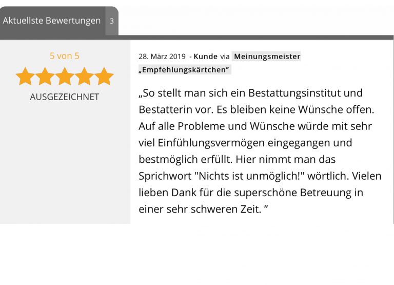 Ich hoffe nicht, dass ich so schnell wieder einen Bestatter benötige. Aber wenn, komme ich sehr gern wieder.