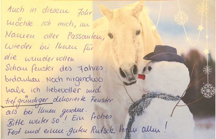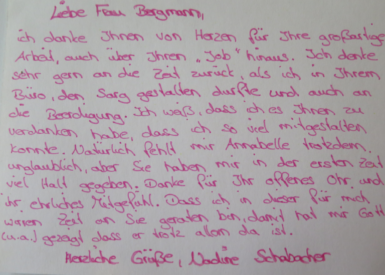 Wir freuen uns über jeden Brief, Danksagungen, persönliche Grüße und Telefonate, die uns nach Trauerfeiern erreichen. Diese Dankeschöns geben uns sehr viel Kraft in unserer Arbeit.