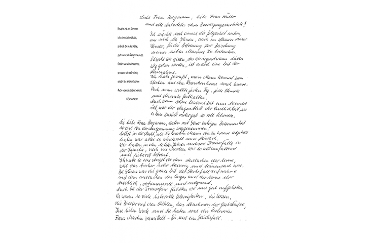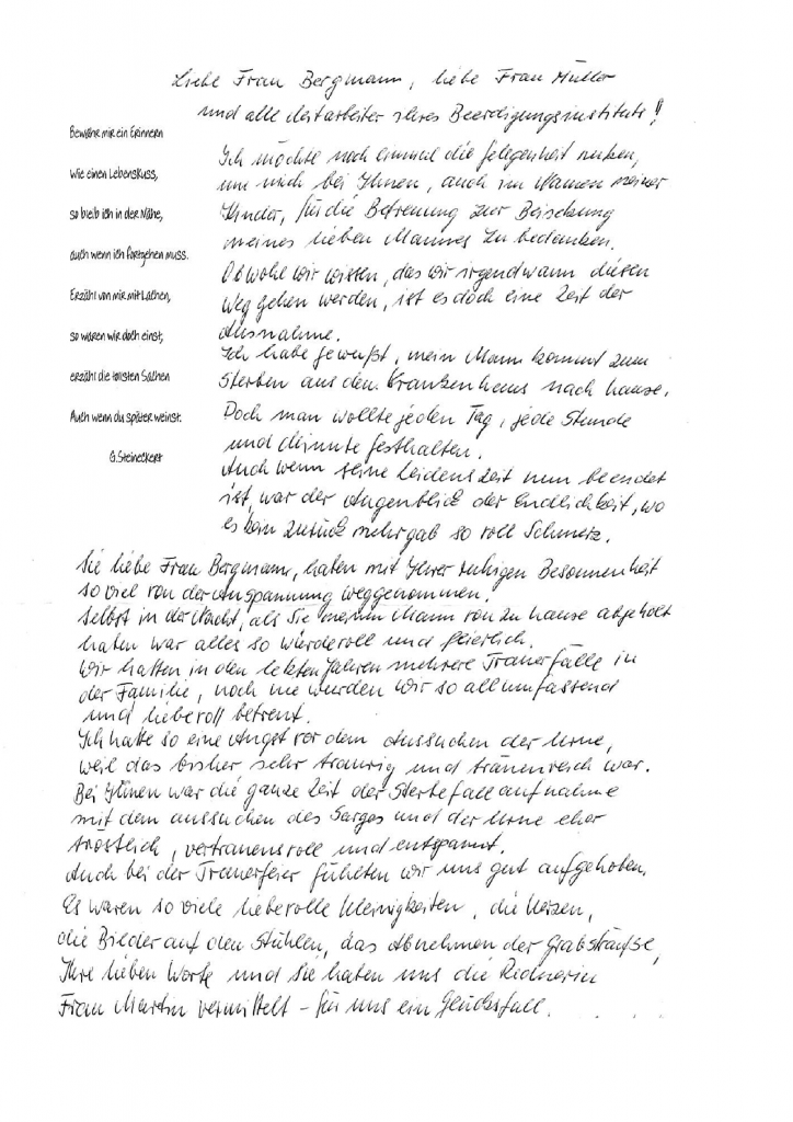 Ich möchten mich ganz besonders bei Ihnen für Ihr großes Einfühlungsvermögen bedanken. Ihr ruhiges und verständnisvolles Wesen war in den schwersten Momenten ein echter Trost für mich.“