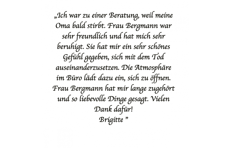 Durch die einfühlsame Beratung und Begleitung durch Fr. Bergmann-Staercke wurde uns der schmerzliche Abschied von unserer Mutter etwas leichter gemacht.