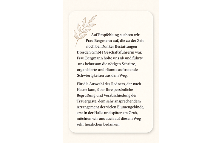 Ihre stille Unterstützung und Ihr respektvoller Umgang mit meiner Verstorbenen Lebensgefährtin sind unbezahlbar. Ich bin Ihnen sehr dankbar für alles, was Sie für mich getan haben.