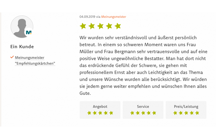 Im Familienunternehmen Bergmann haben wir uns sehr aufgehoben gefühlt. Der Kontakt war persönlich und einfühlsam und sowohl Frau Bergmann als auch ihr Sohn haben sich viel Zeit genommen unseren Verlust nachzuempfinden. Auch hatten wir den Eindruck, dass viele Ideen für die Beisetzung extra auf uns zugeschnitten wurden. Danke für die Flexibilität. Die Trauerfeier hat uns sehr gefallen und Kraft für die kommende Zeit gegeben. Wir können das Bestattungshaus bedenkenlos weiter empfehlen.
