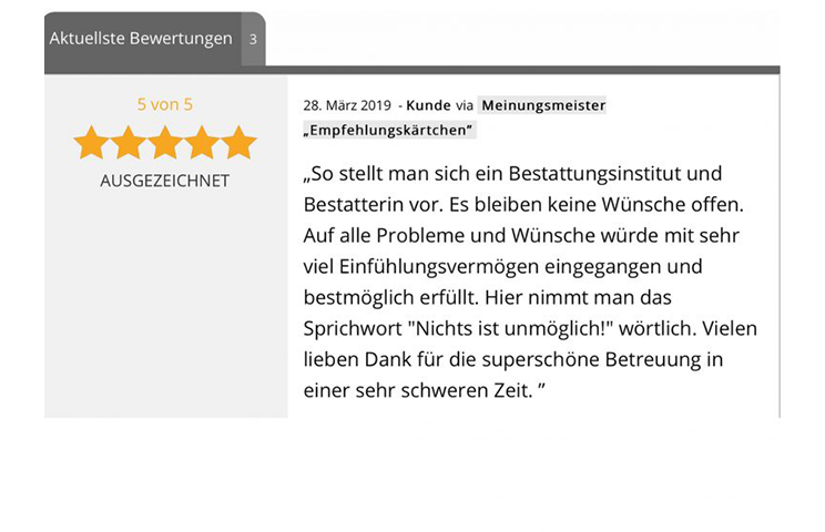 Vielen Dank für die liebevolle und sehr persönliche Betreuung. Es hat mir sehr geholfen, dass Sie auf die individuellen Wünsche der Verstorbenen so flexibel und herzlich eingegangen sind.“