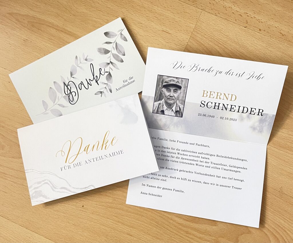Die persönlichere Form und Möglichkeit, auch entfernt wohnende Freunde und Bekannte zu erreichen, ist der Druck von Trauerkarten. Wir helfen gern bei der graphischen Gestaltung. Sie bieten eine Vielfalt der Mitwirkung. Eigene Fotos, Bilder, Gedichte, Texte können mit eingebracht werden. Motive, die im Zusammenhang mit der Persönlichkeit oder deren Hobbys stehen, schaffen oft gedankliche Verbindungen oder ein Schmunzeln in den Erinnerungen. Solche persönlichen Trauerkarten werden oft jahrelang von den Empfängern aufgehoben, manchmal sogar an einer Kerze aufgestellt und auch später immer mal wieder in die Hand genommen.
